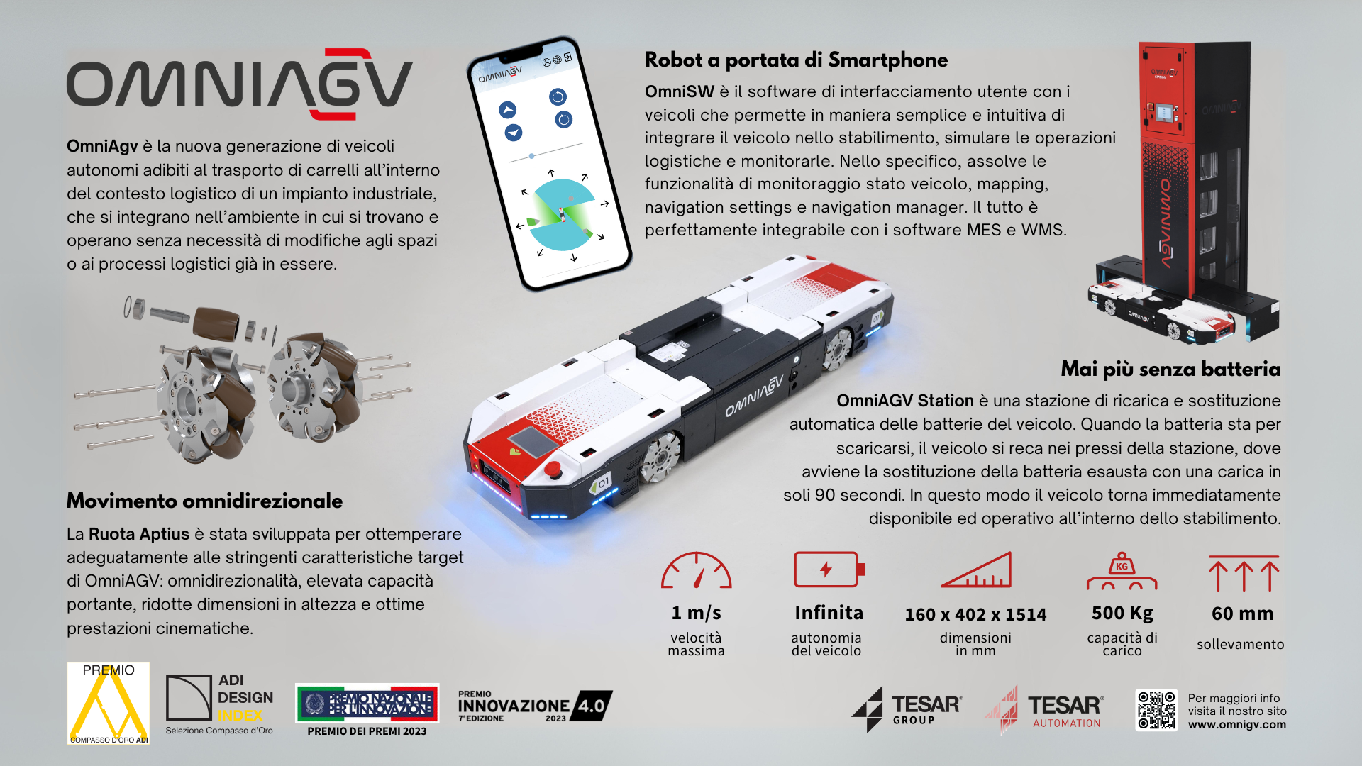 Siamo orgogliosi di comunicare che il progetto OMNIAGV, il veicolo a guida autonoma per la logistica industriale made in Tesar, è stato premiato con il Compasso d’Oro, un grande riconoscimento al duro e costante lavoro di Tesar, Tesar Automation e Ilario De Vincenzo, designer e progettista del veicolo. Il Compasso d’Oro, nato nel 1954, è il più importante premio mondiale per il design industriale, conferito dall’ADI per celebrare l’eccellenza e l’innovazione nel design. Un trionfo che segna un traguardo importante e che conferma e incoraggia a continuare in questa direzione, ricercando costantemente un legame tra innovazione e tecnologia sempre al passo con i tempi. Questo premio è la conferma di un percorso che vede Tesar e Tesar Automation sempre più protagoniste nel panorama industriale, grazie alle tecnologie su cui si fonda OMNIAGV, che permettono di supportare le fabbriche e aiutarle a crescere costantemente durante il loro percorso di digitalizzazione e rinnovamento.